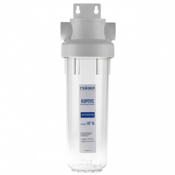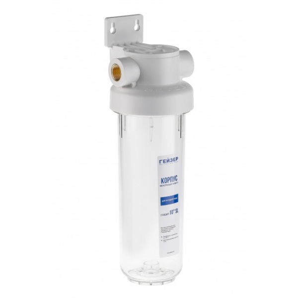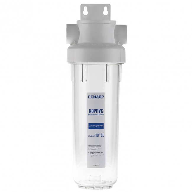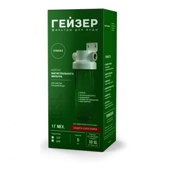 Корпус Гейзер Гарант 10 SL 1/2 прозрачный изготовлен из высокоударопрочного типа пластика пищевого класса. Обладает повышенной стойкостью к механическим повреждениям.